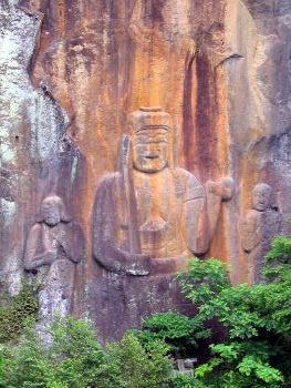 | 日本一の大きさを誇る普光寺の磨崖仏 「正面の大不動明王は、高さが11.3mで磨崖仏(浮き彫り)の中では日本最大です。左に制多迦(せいたか)童子、右に矜褐羅(こんがら) 童子(いずれも5.5m)の二童子を従え、鎌倉期の作と言われています。不動は右手に剣、左手に取り縄盤上にあって体から猛炎を放ち、仏法を強力に広めようと、憤怒の形相をして睨んでいます。雨に打たれると光背火炎がくっきりと浮き出て、一層鋭さが増し威厳が出てきます。右の龕には3mの高さの多聞天があり、武具を身につけ塔と宝棒を持った厳めしい姿で睨んでいます。左の龕には高さ1m余りの磨崖仏が四体あり、左から阿弥陀如来、小矜褐羅童子、小不動明王、小制多迦童子と並んでいます。合計八体の磨崖仏は、いずれも同時期の作で、県指定の文化財となっています。」 朝地町 |