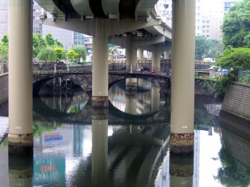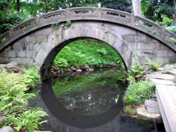 円月橋(えんげつきょう) 文京区後楽 小石川後楽園 朱舜水の設計と指導により名工「駒橋嘉兵衛」が造った。橋が水面に写る影が満月になることからこの名がつけられた。後に八代将軍吉宗が江戸城吹上の庭に造ろうとしたが遂に果たせなかったといわれている。 |