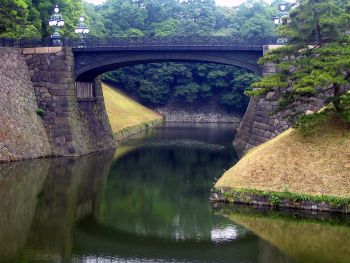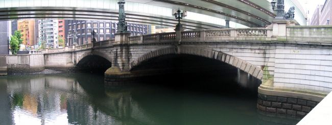皇居前広場から正門を経て宮殿へ至る濠に二つの橋が架かっており、手前の橋が「正門石橋」、奥の橋が「正門鉄橋」です。 「二重橋」は一般にこの二つの橋を総称して言われていますが、厳密には奥の橋を指します。 奥の橋はかつて、「下乗橋」と言われ、橋桁を支えるため、中途に台があって二重構造となっていたことからこの名がつきました。現在の橋は、昭和39年6月に架け替えられたものです。 これらの橋は、通常は使用されず、新年の一般参賀や外国賓客の皇居訪問等宮中の公式行事の際に利用されます。 |