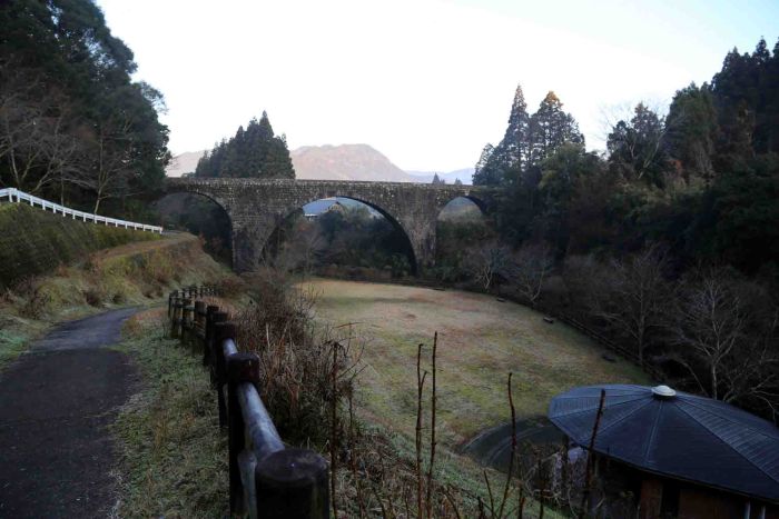 「この橋は川内川最上流の大平官行から吉都線飯野駅までの約30キロのトロッコ軌道の一部として、熊本営林局により木材搬出用に造られたものである。石造3連アーチをもち、正式には「月の木川橋」といい、昭和3年(1928)に完成した。木材でやぐらを組み、それに基づいて50センチ角の石を積み重ね、アーチの一番真中に親石として五角の石が組み込まれている。
