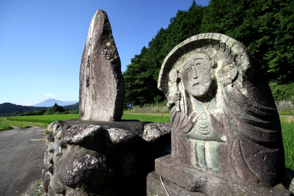 霧島連山を奥に見て、田んぼの横に祀られています
