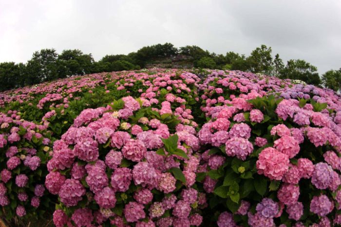 「20万平方メートルに及ぶ初夏の『桃源郷岬』が、200万本もの色とりどりのアジサイで埋め尽くされる光景は圧巻です。