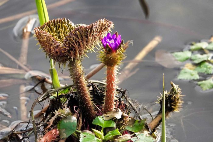 オニバスという名の由来は、七〜八枚の円形の葉が鬼の角のようにトゲを無数に持つことから来ています。そしてその葉と実の間から顔を出す茎の先端から濃い紫色の花が見えます。このオニバスの花は例年八月下旬〜九月中旬のころに咲き出し、その光景は、岩渕大池を華やかな姿に変えることができます。