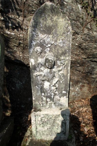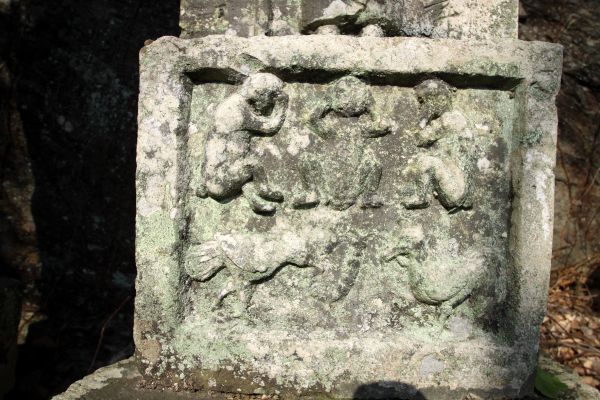 | 下塚庚申塔群 「ここの庚申塔は、堅い石に姿彫りで、台座に三猿が刻まれているのが特徴である。」 |
