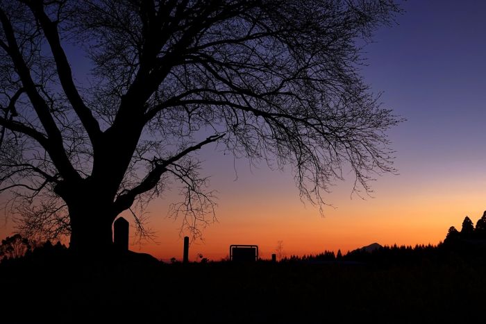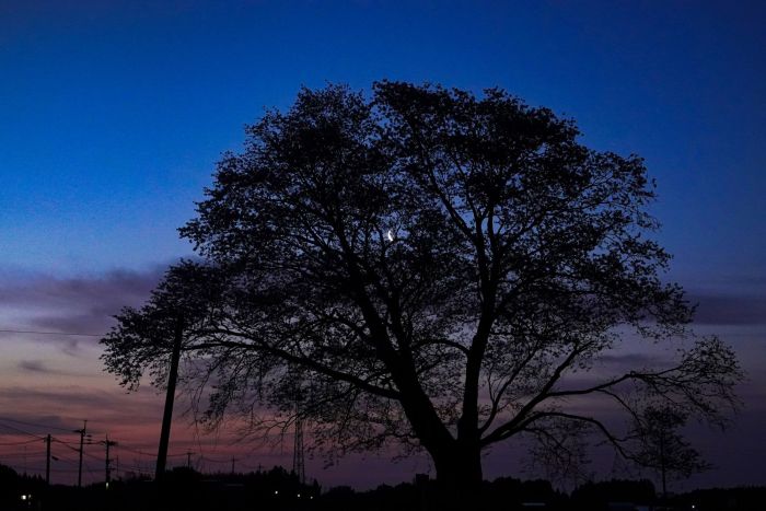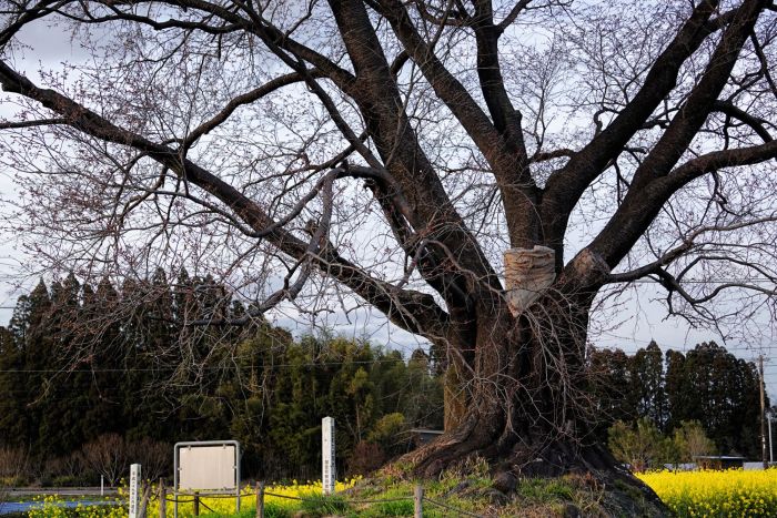 「背後に釈迦ヶ岳を望む大地にそびえ立つこのヤマザクラは、幹周囲約400cm、樹高約15mあり、樹齢100〜150年と推定されています。