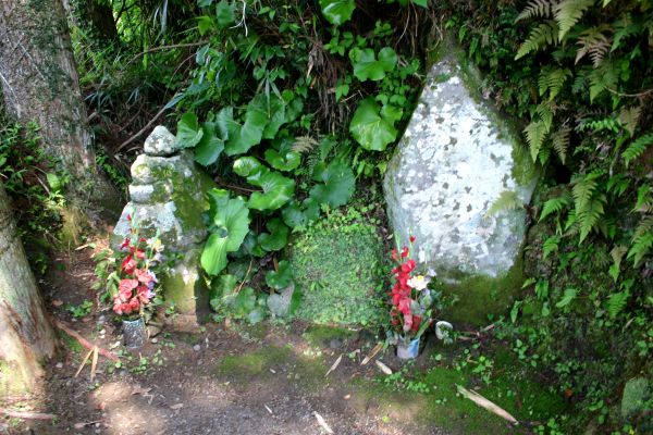 左側の石塔に、「願以此功徳、普及於一切、我等与衆生、皆共成仏道」というブツノ功徳をたたえた掲とともに、鎌倉後期の永仁6年(1298)の年号が墨で書かれています。五輪塔は、上から空・風・火・水・地輪とよばれる五輪を重ねたものです。空・風輪だけは一つの石で、他はそれぞれ別の石で組まれるのが普通ですが、ここの五輪塔は一石で作られていて珍しいものです。」