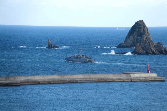 掃海母艦「うらが」(右)と掃海母艦「うらが」(左) 機雷除去訓練と潜水訓練を行うため油津港に入港しています