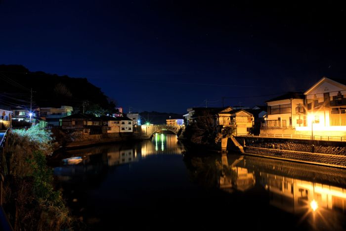 「明治36年(1903)、石工の石井文吉が、堀川運河の油津上町と対岸の材木町を渡すとともに、吾平津神社の参道橋の役割も兼ねて架けた単アーチの石橋である。長さ21m(欄干の両端間)、幅5.65mを計り、現存する石橋としては南那珂地区最大の規模を誇る。