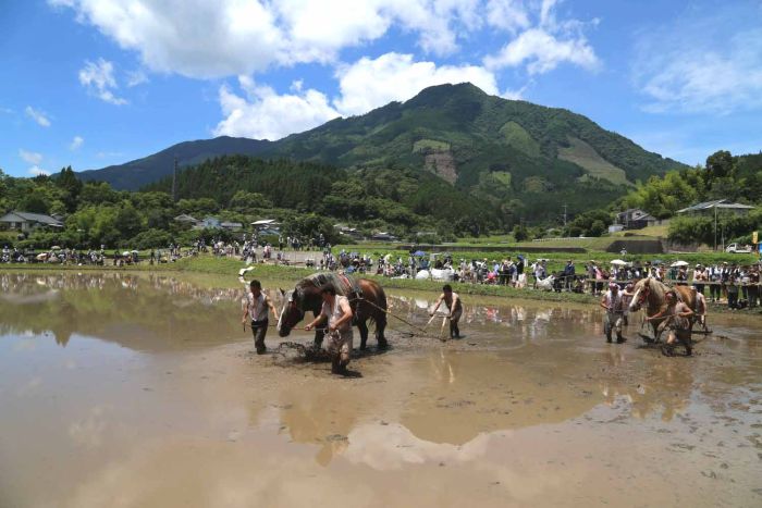 「田代神社の御田祭は、平安時代長元五年(1032年)の創建以来と伝えられ、彦火火出見尊の御神霊を近くの上円野神社よりお迎えし、上の宮田から中の宮田への御神幸により行なわれる田植祭りである。