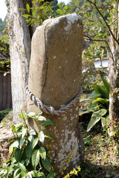 杉の根に押されて傾いています