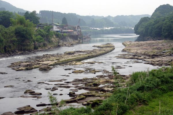 「周囲を山に囲まれた広大な都城盆地の水を一ヶ所に集めて、漏斗口のように吐き出すところが、ここ有水八久保の観音瀬です。藩政時代には、この瀬には大きな岩が林立していて激流となり、その下流は高さ10mぐらいの滝になっていました。 この観音瀬を開削して赤江港に通ずる舟路を開こうと決意したのは、第22代都城領主島津久倫で、久倫はこの難工事を家臣藤崎五百治公寛に命じました。命を受けた公寛は、桂川(山梨県)や吉野川(徳島県)球磨川(熊本県)などの急流や難所を調査し、肥後(熊本県)の石工や船頭を伴って帰り、寛政3年(1791)藩主の許可をまって着工しました。水量の少なくなった冬季の仕事で、激流や岩との闘いですから苦労は並大抵ではありませんでした。 観音瀬左岸に幅一間(1.82m)の舟路の開削工事が竣工したのは、3年後の寛政6年12月のことでした。 これによって、都城の竹之下橋から川口の赤江港までの間を川舟が通行するようになり、都城地方はもとより鹿児島方面の物産も運べるようになりました。 明治22年(1889)、県営工事で更に右岸に一間幅の水路開削が始まり、翌年の明治23年に完成し、ますます舟運は盛んになりました。これらの工事に肥後から来た石工たちがそのまま居着いたのが、ここ八久保地区です。 しかし、陸上交通が発達してきた大正13年(1924)には、大淀川の水利権を取った電気工事株式会社が、ここに水力発電のための堰堤を造りました。それから台風や大雨のたびに都城盆地は大被害を受け、激しい撤去運動が続きました。そして昭和37年(1962)下流の新設ダム完工と同時に轟ダムは撤去されました。こうして昔開削した舟路は再び出現したのです。」
