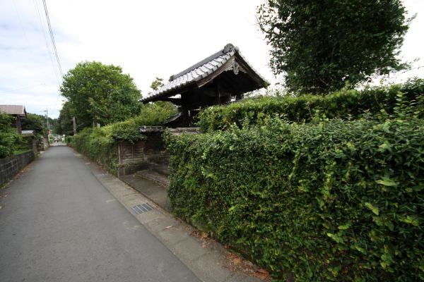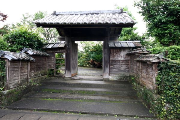 「河上家武家門(市指定有形文化財)と同様に、高岡郷に残る江戸時代の武家門の一つです。扉は観音開きで、禄高80石以上の武家だけに許されたと言われています。また、後方に控柱を付した腕木門の形態は薩摩藩独特で、この門もその特徴を色濃く残しています。安政4年(1857)正月の大火で焼失し、まもなく再建されたと伝えられています。