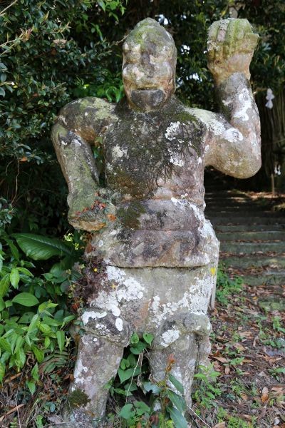 創建以来宇賀大明神社として近郷近在の崇敬者が多く、秋の例大祭日は参詣人建ちで大賑わいとなり、八百年も続きました。戦国末期秀吉の島津征討で、高原城主の上原長門守尚近が飫肥城主への派遣で、高崎・高原及び近郷の武士を引連れ出陣しました。この時飫肥の耕地が、宇賀神社に奉納されています。江戸期の高崎郷取立で、郷総鎮守大明神社になりました。鳥居前の仁王像は、江戸期に境内守護で造立されました。江戸期に宇上町口の龍虎山明寺幸樹院(真言宗)は、当社の別当寺でありました。」 |