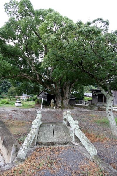 | 子安観音の大クス 県指定天然記念物 「樹齢四〜五〇〇年になると伝えられ、古来より厄病除けの神木として地元の人たちから大切に保護されてきた。樹下にある文化四年(1807)建立の三界万霊の碑は疫病が流行したときに建てられたものといわれ、観音堂やクスノキに抱き込まれてしまった石仏とともに、この木が古くから神木として信仰を集めてきたことを物語っている。 伝説では、数百年前にこのクスノキを伐採したところ疫病が大流行したため、厄払いの祈願を行い神木として大切に育てたといわれている。有福(ありふく)の地名もこれに由来するらしい。 根回り14.65メートル、幹周り7.6メートルと著しい巨木ではないが、周囲の環境がよく樹勢も盛んである。地上より2.5メートルのところで七本の大枝に分かれているが、これは伝説のとおり一度伐採されたことを物語っているのではないだろうか。」 佐世保市教育委員会 |
