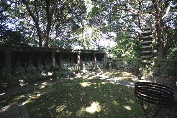 「寛永14年“島原の乱”のキリスト教徒は大挙して島原城(旧森岳城)を包囲、その時島原南部寺院の僧の首をはね、槍の穂先につきさしお城大手門へとさっとうした。あらゆる手段をこうじて攻撃を加えたが落城しないので、ついにその時廃城になっていたこの地(丸尾城跡)にたてこもり海岸の船を焼き払い、完全に島原城を包囲したのである。このような状況下で社寺はもとより地蔵様の首はキリスト教徒によってはねられたのである。この中で地蔵様の一体は冠をかぶった将軍地蔵で地蔵様ではないと思ったのであろう御無事です。」