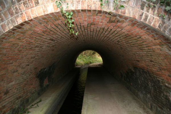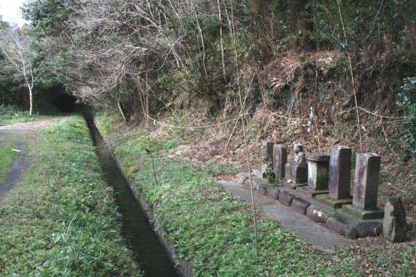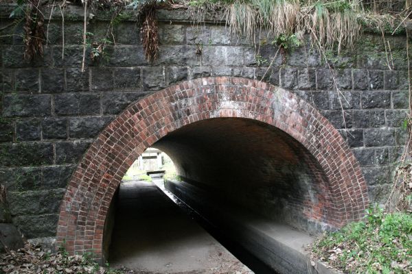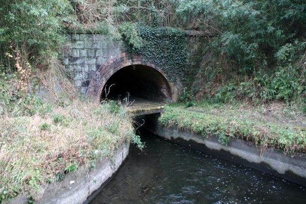 水神様や石像が並ぶところ、水路の奥に煉瓦アーチが見えました