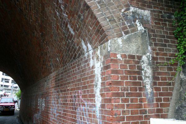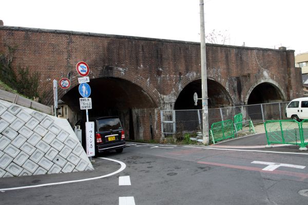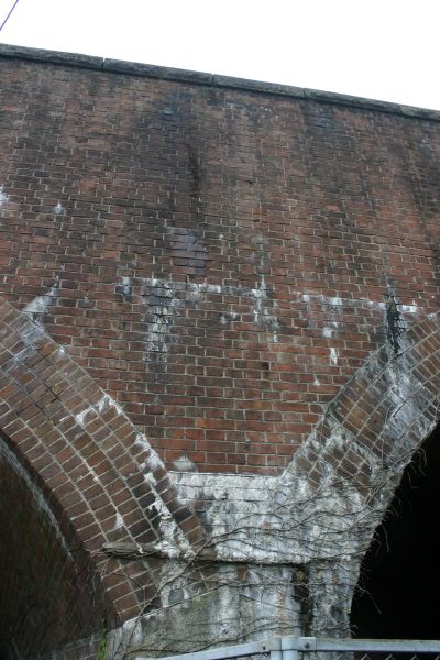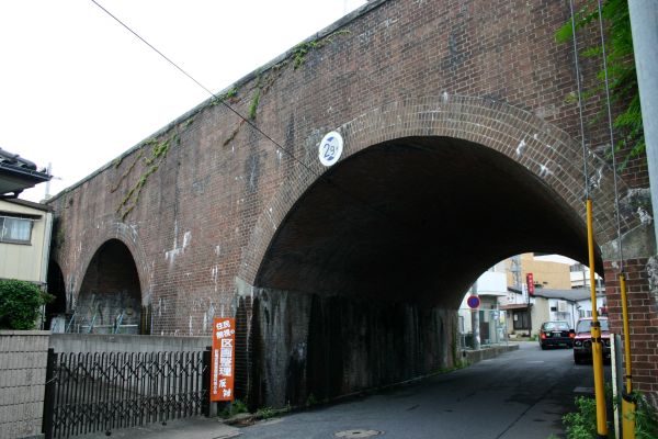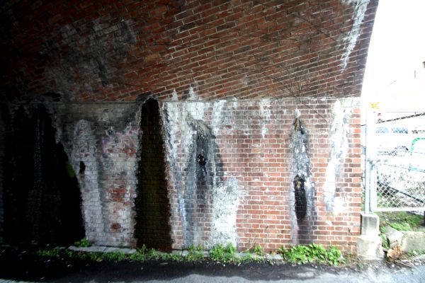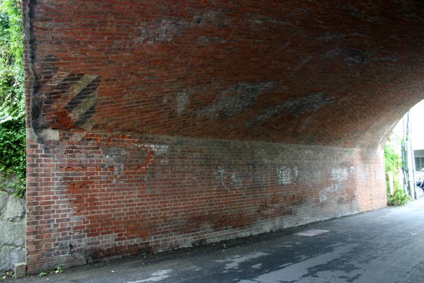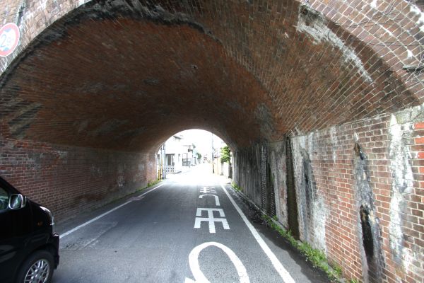 アーチ部分の煉瓦が傾けて積んであり、螺旋を描いているように見えます。強度を保つために、上部の線路と直交するように積んでいくとこのようにねじれたようになるそうです