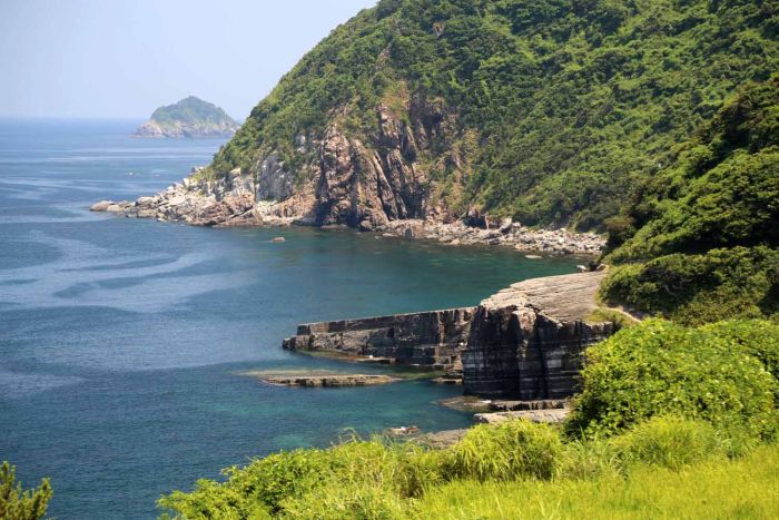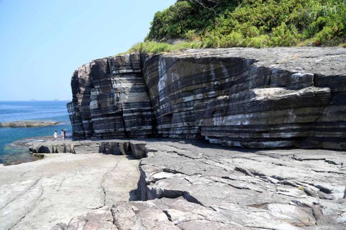 「須佐層群が堆積したあと、その中に高温の火成岩体(高山斑れい岩)が貫入しました。(中新世中期)