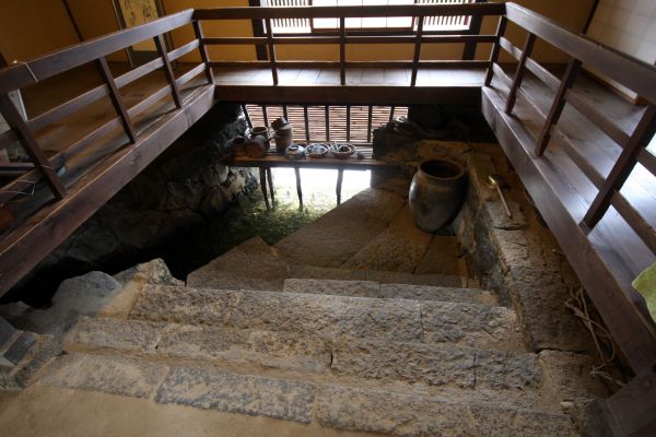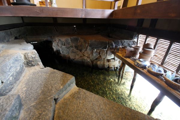庭園から流れ出た水は、建物の下をくぐって、台所のハトバに出てきます。ここで野菜や茶碗を洗った水はまた藍場川に還っていきます。