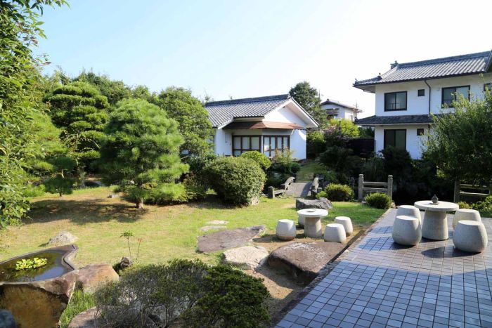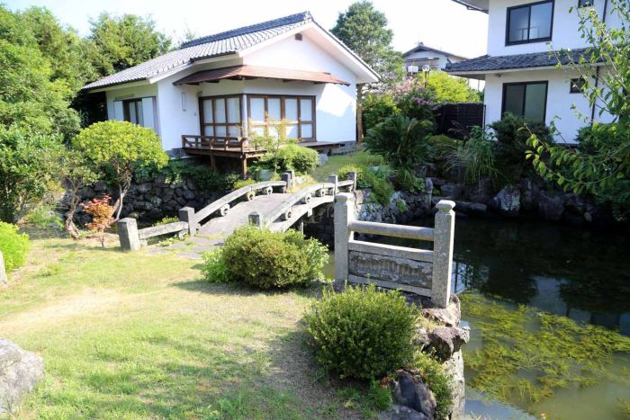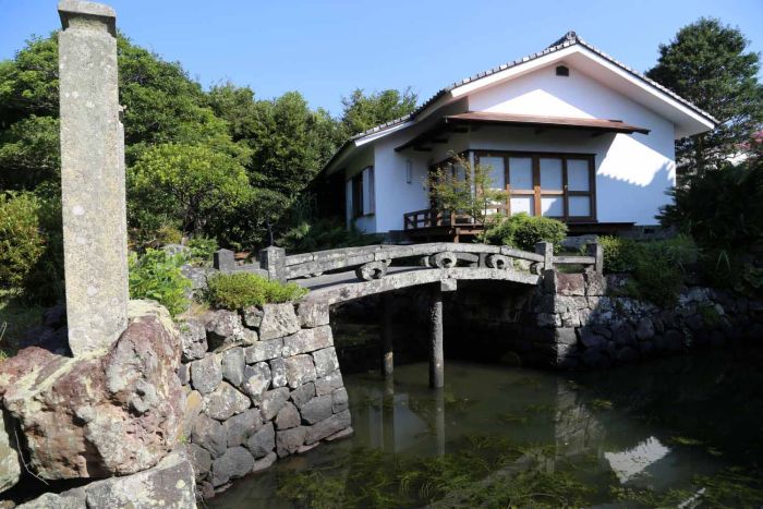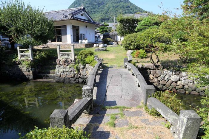 「幕末の絵図をみると、この場所は児玉三郎右衛門の屋敷地にあたります。児玉家は、萩藩の寄組で、当時は現在の平安古鍵曲の方を正面とする広大な屋敷地を構えていました。庭園はこの屋敷地の奥の方にあり、橋本川から水を引き入れる水路と、笠山石の護岸と舟付場が設けられた池、この池に架かる石橋などが周囲の樹木などとともによく残されています。このような庭園は、舟入式池泉庭園(ふないりしきちせんていえん)と呼ばれ、かつては川沿いに数多くつくられた武家屋敷の庭園の形式をよく残した貴重な遺構と言えます。」 |