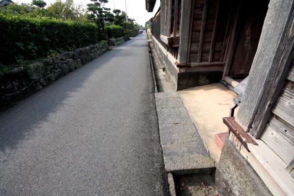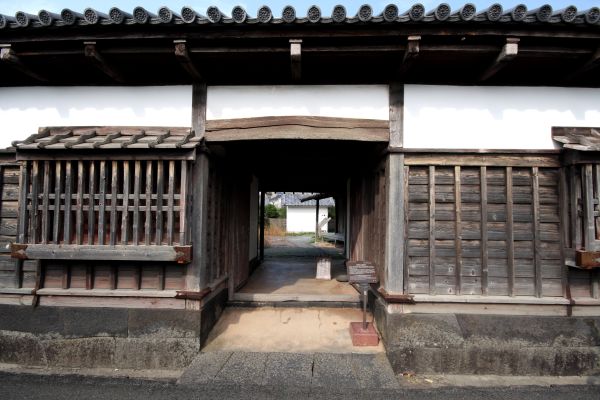 中央から東寄りの所に、2.46m幅の門を構えて開き扉を設けている。建物の外観は腰部を下見板張りとし、基礎に見事な切石積みがあり、上部は白漆喰大壁造である。江戸中期の代表的な武家屋敷長屋の様式を残している。」 |