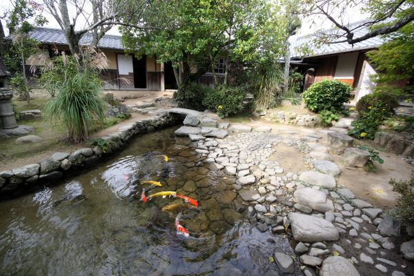 駐車場まで戻り、ふと旧湯川家を覗くと石橋が見えました