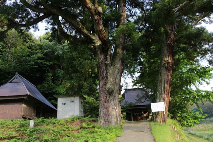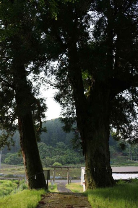 「河内神社境内にある『夫婦杉』と呼ばれる二本の杉は、目通し幹周りが501cmと317cmを測る。
