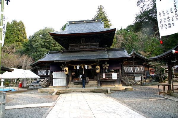 本社殿は室町時代に建立されたものを、ここに移築したものである。本殿内にある宝物殿の板に「天文十六年云々」の墨書があるので、本殿の建立もその頃と考えられる。本殿は三間社入母屋造り、拝殿は二重入母屋楼門造りでともに室町時代の様式をよく伝えている建物である。本殿の正面にある三つの蟇股にそれぞれ松竹梅の彫刻が見られるが、これはわが国で建築の装飾に松竹梅の組み合わせをとりいれた最も時代の古いものとして有名である。
