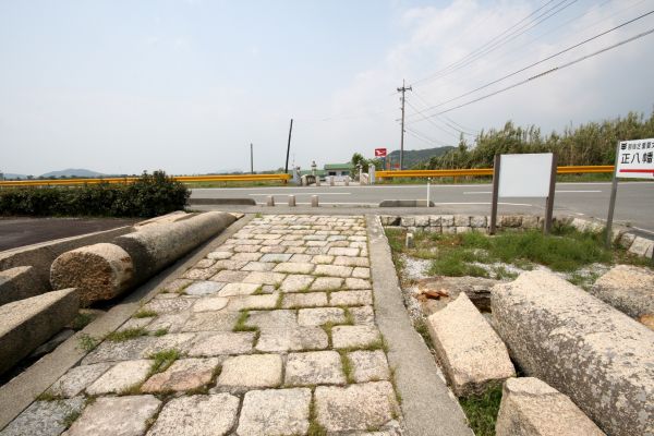 正八幡宮入口、石畳道が県道194号線で途切れていますが、その向こう側、長沢川に3径間桁橋が架かっています